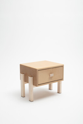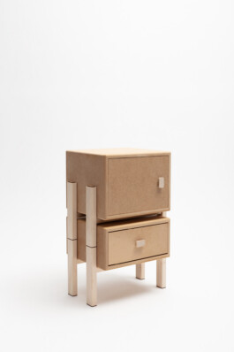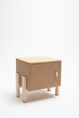 The plug-in system consists of two laser-cut MDF plates. When assembled, the smaller plate slides into the recess of the larger one, creating a stable and precise connection. A plate with two cutouts connects the two furniture legs securely side by side.