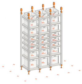 Das Raster ist an Böden und Decke gut sichtbar markiert und teilweise als Befestigungen für die neue Einrichtung ausgeführt.Eingespannte Aluminiumprofile werden durch Regalböden und Stahlnetze zu Stauraum- und Präsentationsflächen ergänzt. Innerhalb der Regalstruktur bieten Eurokisten Platz für zahlreiche Forschungstools. Ein farbig akzentuiertes Leitsystem erleichtert die Orientierung.